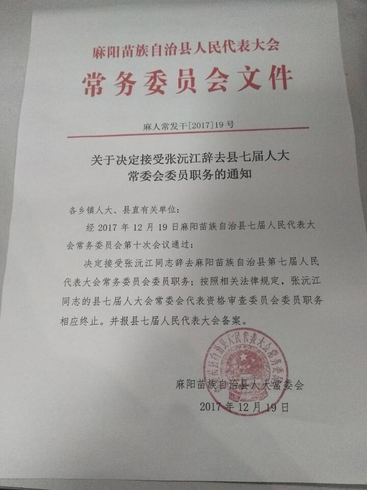关于决定接受张沅江辞去县七届人大常委会委员职务的通知