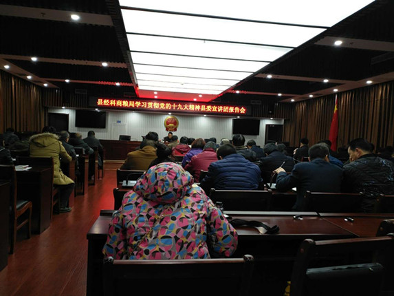 目前,县经科商粮局全体干部职工以县委宣讲团报告会为契机,深入开展学习党的十九大精神,结合本职工作抓紧抓实、抓出成效。(彭绍辉)